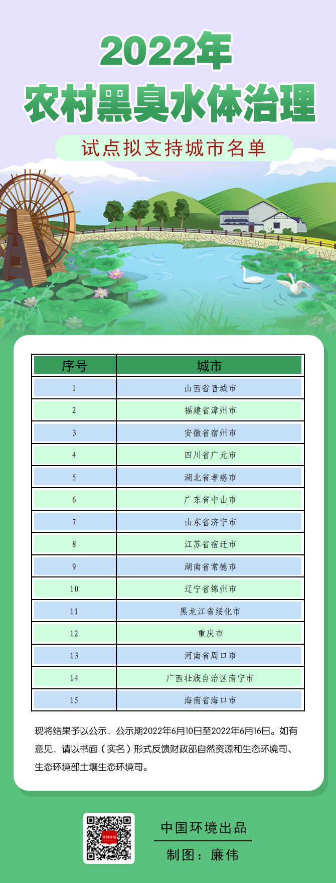 根據(jù)競爭性評審結(jié)果,財政部、生態(tài)環(huán)境部擬將15個城市確定為2022年支持的農(nóng)村黑臭水體治理試點(diǎn)城市,2022年6月10日至2022年6月16日為公示期。期間如有意見,請以書面(實(shí)名)形式反饋財政部自然資源和生態(tài)環(huán)境司、生態(tài)環(huán)境部土壤生態(tài)環(huán)境司。