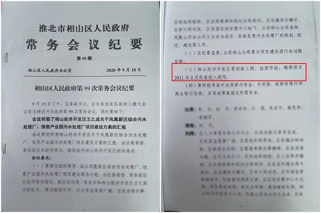 事情是這樣的:相山經濟開發區早年開發了一個食品工業園,弄好沒多久,鳳凰山經濟開發區規劃環評審查意見就明確指出,這個食品工業園污水處理依托的丁樓污水處理廠已無余量,應啟動污水處理廠建設,建成運行前不得新建污水排放項目。