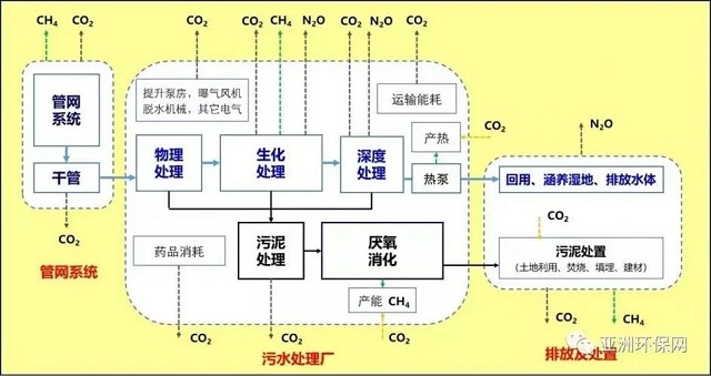 污水處理過程實際就是碳排放的過程,污水處理行業的碳排放量約占全社會總排放量的1%,在環保產業中占比最大。污水處理過程中會排放二氧化碳、甲烷和氧化亞氮。其中,二氧化碳主要來源于污水治理設施的能耗過程,而水污染物降解產生的二氧化碳則認定為生源性碳排放;甲烷主要來源于污水處理厭氧環節,包括管網、厭氧池、化糞池、污泥厭氧消化池等;氧化亞氮主要來源于污水處理過程的硝化反硝化階段。