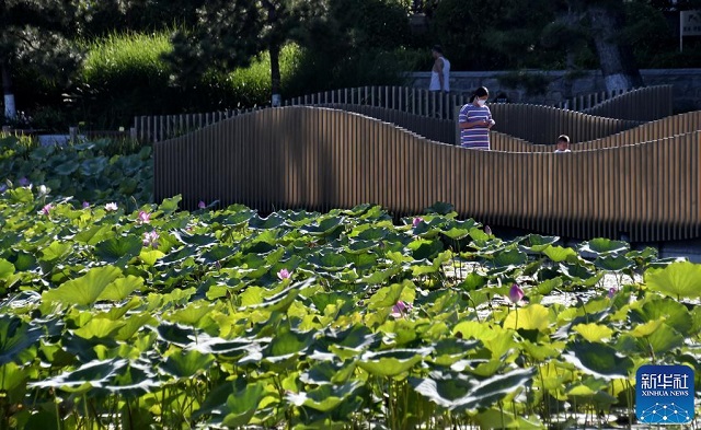 9月5日,市民在龍?zhí)段骱闲蓍e。龍?zhí)段骱仔陆艘蛔側(cè)莘e9萬立方米的調(diào)蓄池,通過硅砂蜂巢調(diào)蓄凈化系統(tǒng)對來水水質(zhì)進(jìn)行處理。