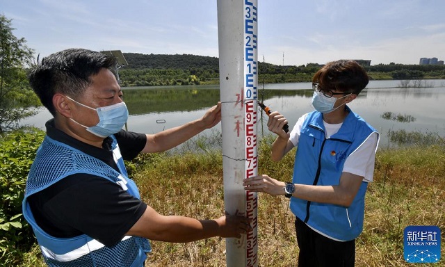 9月8日,管護(hù)人員在檢查阜石路西郊雨洪調(diào)蓄工程的水位測量設(shè)備。