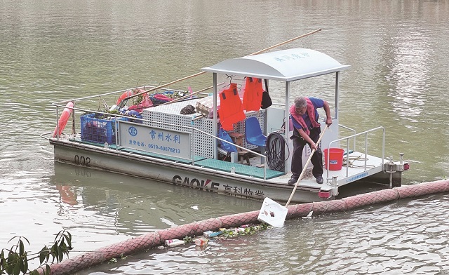 在老大運(yùn)河中吳大橋段,兩座長達(dá)20多米的漂浮物攔截設(shè)施橫貫水面,如同一張過濾網(wǎng),攔截上游漂浮來的垃圾,等待河道保潔員清理。“一天最起碼能收集到五六船垃圾,有七八百斤。有了這個(gè)攔截設(shè)施,河面上的垃圾基本不會(huì)往下游去了。”市河道湖泊管理處河道保潔隊(duì)隊(duì)長蔣建國介紹。