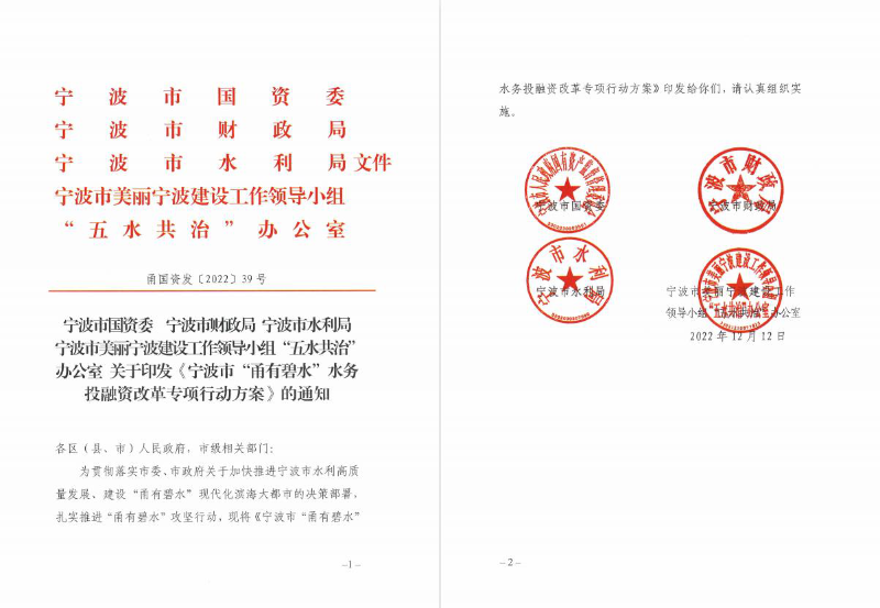為加快推進(jìn)寧波市水利高質(zhì)量發(fā)展、建設(shè)“甬有碧水”現(xiàn)代化濱海大都市,市國(guó)資委、市水利局、市財(cái)政局、市“五水共治”辦等四部門(mén)聯(lián)合出臺(tái)《寧波市“甬有碧水”水務(wù)投融資改革專(zhuān)項(xiàng)行動(dòng)方案》(以下稱(chēng)《行動(dòng)方案》)。
