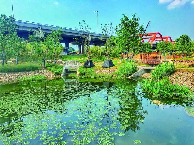 “海綿+”助力解決民生痛點(diǎn) 寅春路立交鐵路涵洞一到汛期就容易產(chǎn)生積淹水,給行人、車輛帶來(lái)極大的困擾。為解決積淹水問(wèn)題,項(xiàng)目采用“海綿+積淹水點(diǎn)整治”的設(shè)計(jì)思路,堅(jiān)持“源頭減排、過(guò)程控制、系統(tǒng)治理”的技術(shù)路線,對(duì)涵洞附近的涂家營(yíng)溝河道進(jìn)行改造,提高區(qū)域整體排水能力。改建涵洞附近現(xiàn)有的市政雨水管,以保障積淹水點(diǎn)排水通暢。此外,公園附近的高架雨水經(jīng)斷接消能處理后,與涵洞內(nèi)雨水一起匯入公園雨水濕地、調(diào)蓄水體、旱溪等海綿設(shè)施內(nèi),在整治積淹水點(diǎn)的同時(shí),解決路面雨水污染問(wèn)題。