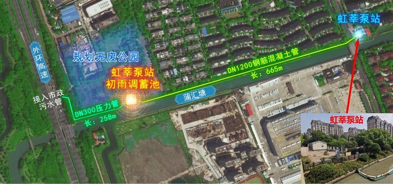 該工程位于上海市閔行區七寶鎮外環高速東側,蒲匯塘北側。新建調蓄池服務范圍與閔行區井亭排水系統一致,匯水面積約130公頃,設計調蓄規模達4700立方米。項目包含一座初雨調蓄池土建和機電安裝、配套進水管及出水壓力管,一座地下變電所及附屬工程等。