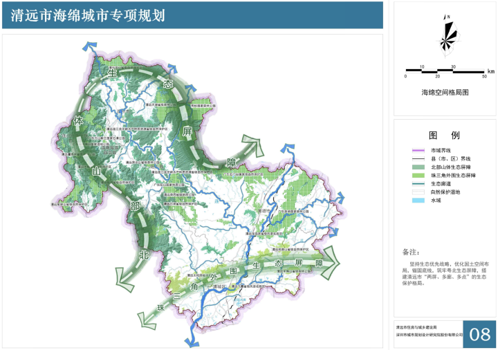 根據(jù)《規(guī)劃》,清遠將構(gòu)建“兩屏、多廊、多點”的海綿生態(tài)空間格局。“兩屏”即北部環(huán)形生態(tài)屏障和珠三角外圍生態(tài)屏障。強化與周邊連綿山體的空間銜接和協(xié)同治理,推進南嶺、筆架山、三桂山等山體屏障的生物多樣性保護、水土保持及水源涵養(yǎng),筑牢生態(tài)安全屏障,以限制城鎮(zhèn)建設(shè)無序擴張。生態(tài)屏障內(nèi)限制開發(fā)建設(shè)行為,針對連接屏障之間的耕地、城鎮(zhèn)等用地進行嚴格管控,禁止破壞生態(tài)安全的活動,保障屏障的連續(xù)性和生態(tài)安全格局的完整性。