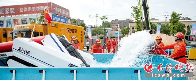 因雨勢(shì)加大,某地鐵站出現(xiàn)內(nèi)澇,嚴(yán)重影響地鐵運(yùn)行安全。市城區(qū)防辦緊急調(diào)度防澇排漬搶險(xiǎn)隊(duì)一輛高揚(yáng)程排水搶險(xiǎn)車趕赴現(xiàn)場(chǎng)處置……不必?fù)?dān)心,這驚險(xiǎn)的一幕,只是2024年長(zhǎng)沙市城區(qū)應(yīng)對(duì)超強(qiáng)降雨防澇排漬聯(lián)合應(yīng)急演練中的場(chǎng)景。5月15日,在隆平水稻博物館前坪,共有11支搶險(xiǎn)隊(duì)伍、135人參加演練。一小時(shí)能吸干兩個(gè)泳池的超級(jí)吸水“牛魔王”5000型子母式大流量排水搶險(xiǎn)車、排水揚(yáng)程超過(guò)15層樓高的900型高揚(yáng)程排水搶險(xiǎn)車等排水“超級(jí)”裝備紛紛亮相、大顯身手。
