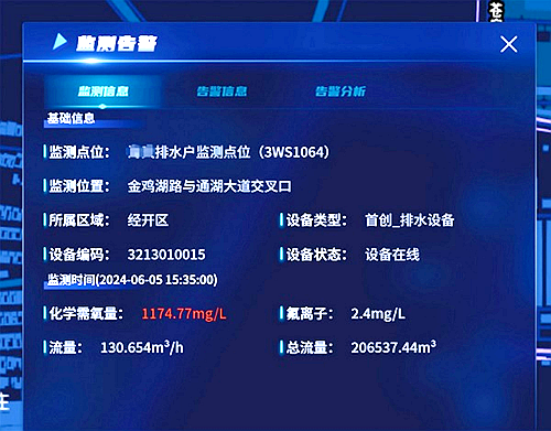 目前,宿遷市已搭建了統(tǒng)一的物聯(lián)感知平臺(tái)、視頻中臺(tái),打造了國(guó)內(nèi)領(lǐng)先的城市物聯(lián)感知體系,實(shí)現(xiàn)監(jiān)測(cè)數(shù)據(jù)的實(shí)時(shí)匯聚接入、智能處理分析。共完成1.8萬(wàn)公里基礎(chǔ)管線(xiàn)匯聚治理,累計(jì)上報(bào)庫(kù)表類(lèi)監(jiān)管數(shù)據(jù)49萬(wàn)余條,燃?xì)狻⒐┧⑴潘蛄簩?shí)時(shí)監(jiān)測(cè)數(shù)據(jù)8660萬(wàn)條,同步完成18類(lèi)約40萬(wàn)條市級(jí)數(shù)據(jù)共享。系統(tǒng)特色場(chǎng)景應(yīng)用包括水源地、供水、排澇、污水、城市河道水位水質(zhì)等城市水務(wù)全流程監(jiān)管,實(shí)現(xiàn)燃?xì)夤?yīng)端、輸配端、用戶(hù)端風(fēng)險(xiǎn)隱患的常態(tài)化跟蹤監(jiān)管,賦能城市生命線(xiàn)安全治理。系統(tǒng)試運(yùn)行以來(lái),全市共發(fā)現(xiàn)隱患點(diǎn)位1467個(gè),布設(shè)及安裝智能傳感監(jiān)測(cè)設(shè)備1590套,覆蓋中心城市示范區(qū)橋梁8座及管線(xiàn)900公里,全面推動(dòng)傳統(tǒng)基礎(chǔ)設(shè)施領(lǐng)域安全生產(chǎn)管理向數(shù)字化、智慧化轉(zhuǎn)型,公共安全治理從“事后被動(dòng)應(yīng)對(duì)”向“事前主動(dòng)預(yù)防”大步邁進(jìn)。圖為宿遷市某排水企業(yè)水質(zhì)超標(biāo)報(bào)警信息。