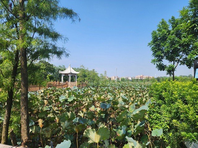 在潮陽金浦梅花濕地,棧道、涼亭、荷花、白鷺與周圍的稻田串聯(lián)成一幅美輪美奐的生態(tài)畫卷。