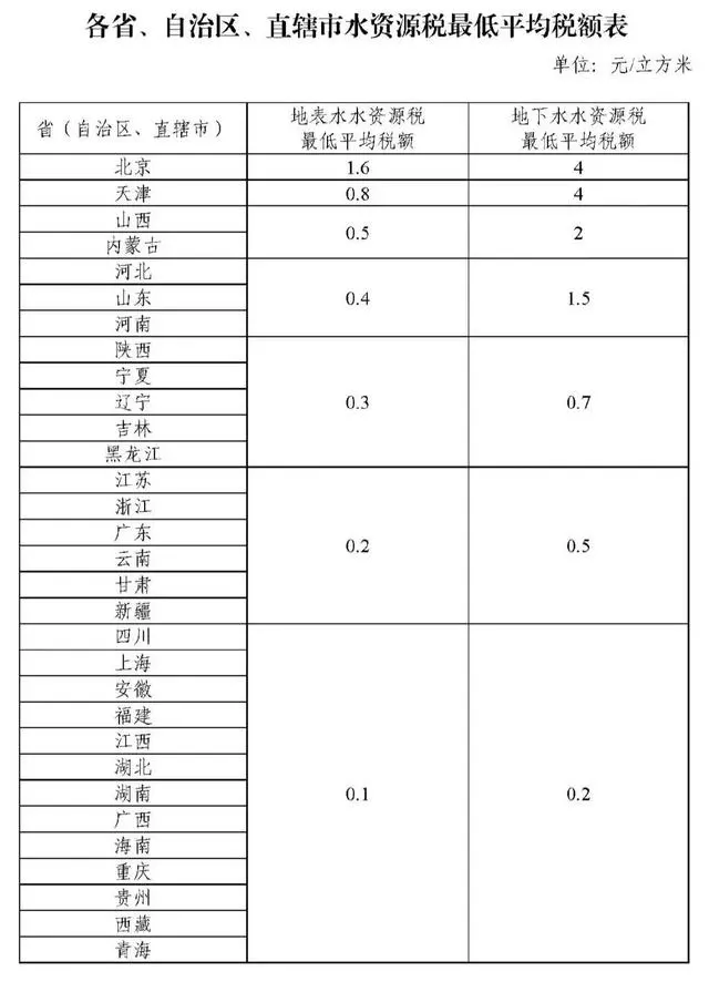 附:各省、自治區(qū)、直轄市水資源稅最低平均稅額表