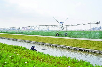 浙江舟山市岱山島,平移式噴灌機在由鹽田改造而成的農(nóng)業(yè)產(chǎn)業(yè)園中作業(yè)。新華社發(fā)