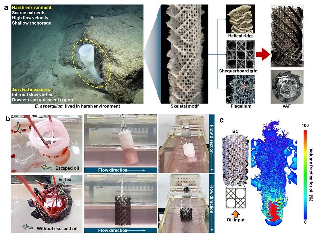 深海玻璃海綿(又稱“維納斯花籃”)是一種在1000m水下固著生長(zhǎng)存活上萬(wàn)年的生物,在適應(yīng)惡劣環(huán)境的自然選擇過(guò)程中演化出獨(dú)特的結(jié)構(gòu),對(duì)復(fù)雜流態(tài)和貧營(yíng)養(yǎng)環(huán)境具有良好的適應(yīng)性。受這一現(xiàn)象啟發(fā),尤世界教授團(tuán)隊(duì)創(chuàng)新提出了一種仿玻璃海綿渦流錨固過(guò)濾器(VAF)并利用3D打印技術(shù)進(jìn)行重構(gòu),解析了內(nèi)棋盤網(wǎng)格+外脊螺旋復(fù)合結(jié)構(gòu)對(duì)外部湍流能量削減轉(zhuǎn)化形成內(nèi)部小尺度渦流的多物理場(chǎng)場(chǎng)協(xié)同機(jī)制,賦予了VAF卓越的流體動(dòng)力學(xué)穩(wěn)定性、高效的界面?zhèn)髻|(zhì)特性和更長(zhǎng)的內(nèi)部停留時(shí)間,實(shí)現(xiàn)了亞臨界至超臨界流態(tài)范圍內(nèi)穩(wěn)定捕集浮油、乳化油和溶解油,捕集率高于97%。該研究體現(xiàn)了環(huán)境工程、流體力學(xué)、生物物理學(xué)和仿生學(xué)的深度交叉融合,為解決復(fù)雜水動(dòng)力環(huán)境下的油類污染原位捕集和水環(huán)境修復(fù)提供了全新的思路和方法。