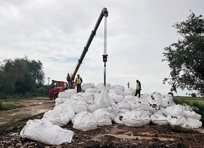 內蒙古包頭市土默特右旗的搶險人員加快調運噸包等防汛物資(2025年8月10日攝)王靖攝