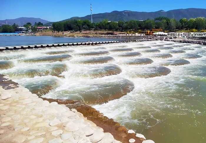 施工現場穩中有序 保障安全前提下減少對生態的影響 在蓮石湖跌水修復施工現場,河道岸坡已被修葺一新,湖中央設計的三級圍堰跌水結構,通過高低落差的層次感減緩上游水流流速。而在門城湖的魚鱗跌水,則是通過階梯式的魚鱗結構實現水流消能。