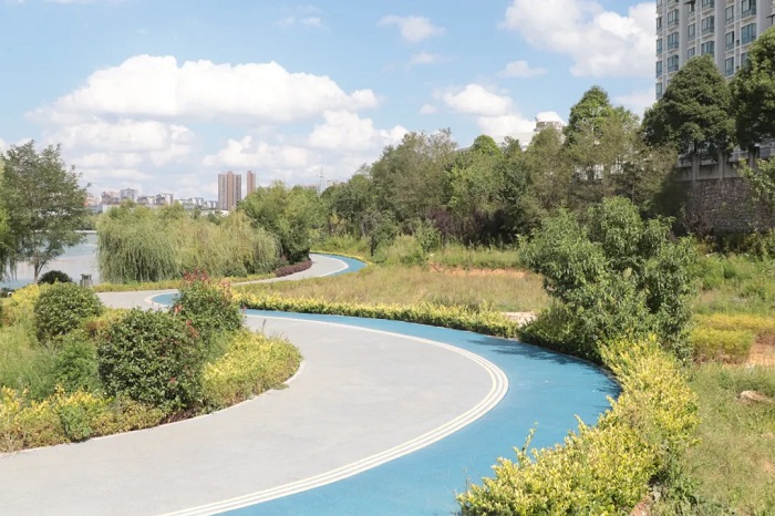 位于安順經(jīng)開(kāi)區(qū)的花山綠道,總長(zhǎng)約2.4公里,保留原162鐵路原始風(fēng)貌,沿線設(shè)置三線文化廣場(chǎng)、休息椅等設(shè)施,同時(shí)鋪設(shè)透水路面、建設(shè)植草溝,既串聯(lián)起休閑健身與文化體驗(yàn)功能,又能有效滯留雨水。老城環(huán)路虹山湖路段則打造了下沉式綠地、觀景平臺(tái),夜晚燈光亮起時(shí),成為市民休憩打卡的熱門地點(diǎn)。市政道路與背街小巷的海綿化改造也同步推進(jìn),通過(guò)鋪設(shè)透水路面、打造下凹式綠化帶等方式,讓雨水“落地即滲”。