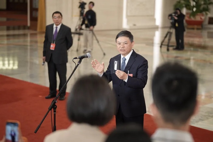 3月12日,北京,人民大會堂,十四屆全國人大四次會議第三場“部長通道”集中采訪活動,生態環境部部長黃潤秋接受記者采訪。(中青報·中青網記者 李雋輝/攝)
