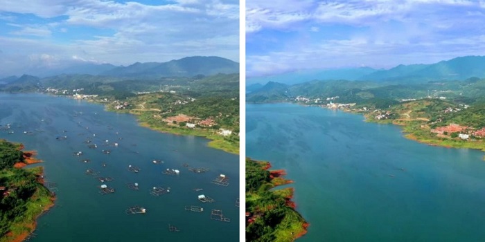 東江湖網(wǎng)箱退水上岸前后對(duì)比圖。
