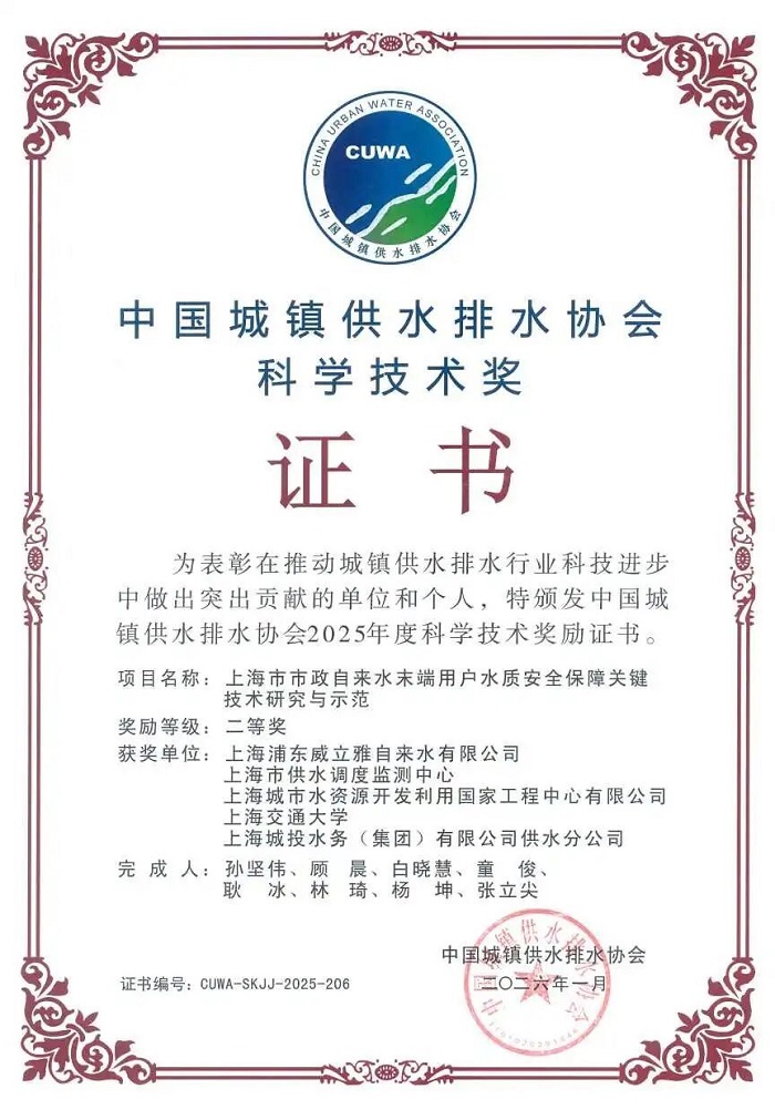 4月16日,2025年度中國城鎮供水排水協會科學技術獎頒獎儀式在深圳舉行。上海市供水調度監測中心聯合上海浦東威立雅自來水有限公司、上海城市水資源開發利用國家工程中心有限公司、上海交通大學、上海城投水務(集團)有限公司供水分公司等5家單位完成的項目“上海市市政自來水末端用戶水質安全保障關鍵技術研究與示范”獲中國城鎮供水排水協會科學技術獎二等獎。