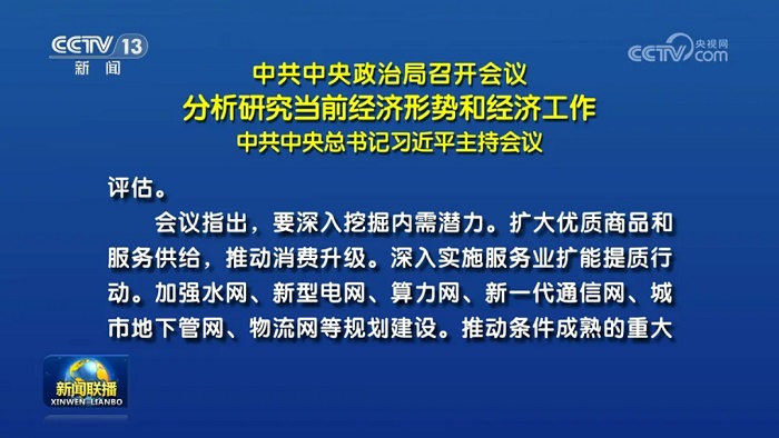 會議指出,要深入挖掘內需潛力。擴大優質商品和服務供給,推動消費升級。深入實施服務業擴能提質行動。加強水網、新型電網、算力網、新一代通信網、城市地下管網、物流網等規劃建設。推動條件成熟的重大工程項目開工。
